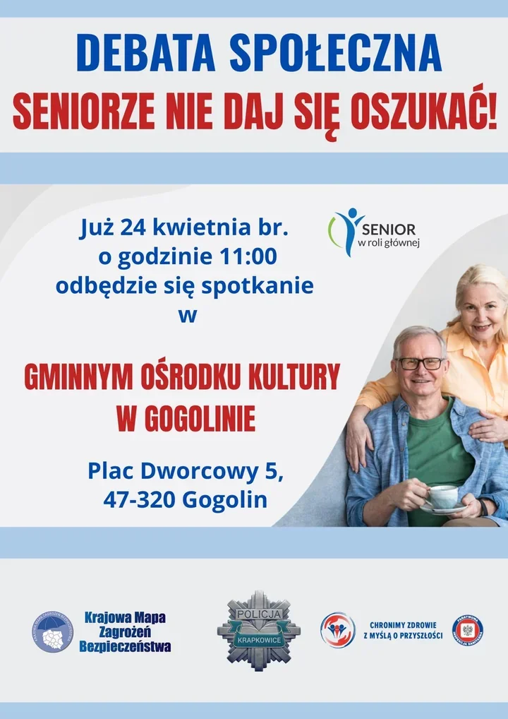 W Gogolinie policjanci ponownie usiądą z mieszkańcami do rozmowy o oszustwach, które najczęściej uderzają w seniorów. Komenda Powiatowa Policji w Krapkowicach zapowiada debatę społeczną, podczas której mundurowi pokażą, jak działają przestępcy i jak zmieniają swoje metody. Spotkanie odbędzie się 24 kwietnia o godzinie 11:00 w Gminnym Ośrodku Kultury w Gogolinie.