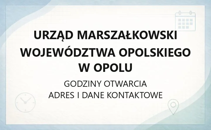 Urząd Marszałkowski Województwa Opolskiego przyjmuje interesantów w kilku budynkach w Opolu i prowadzi punkt informacyjno‑kancelaryjny, a także sieć punktów informacyjnych Funduszy Europejskich. Najważniejsze kontakty, adresy, godziny oraz praktyczne wskazówki dotyczące wizyty i obsługi osób z niepełnosprawnościami znajdziesz poniżej.